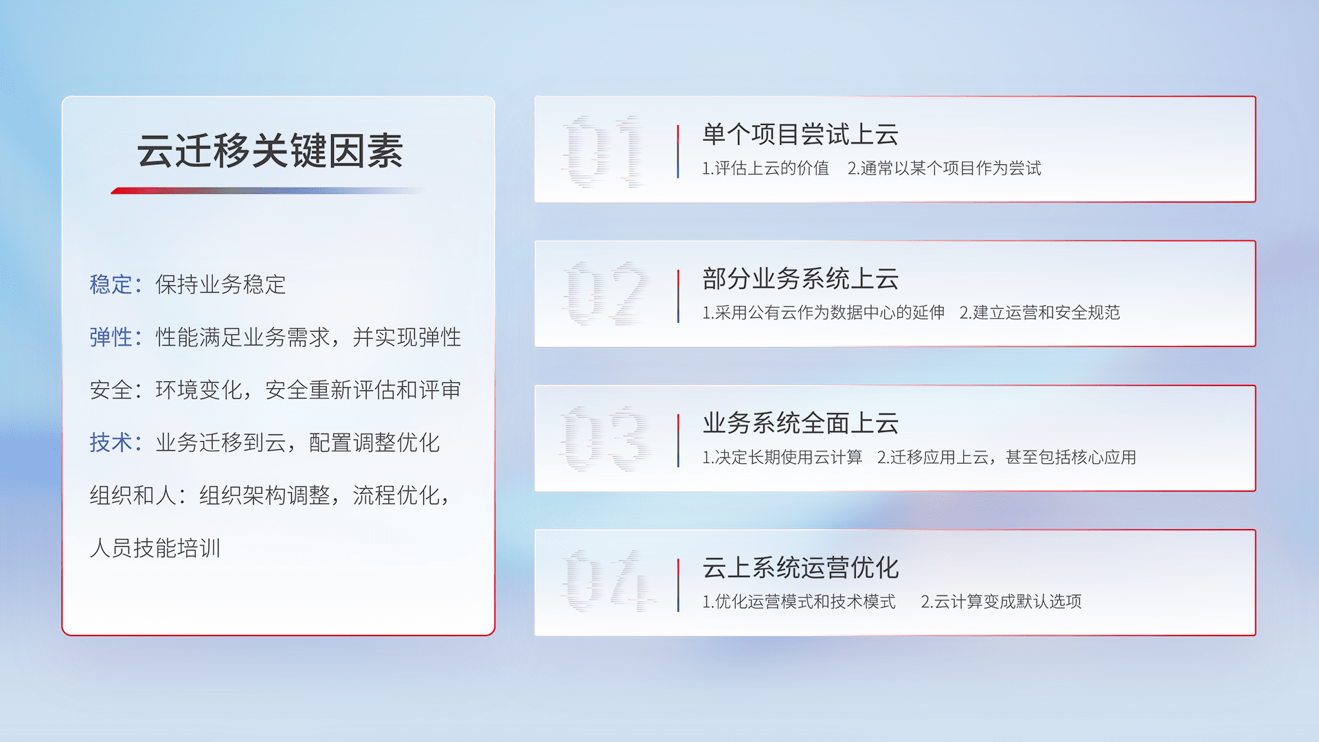 结合实际业务,,从规划设计、、、、云平台选型、、、、云原生改造、、、、数据迁移、、、、集成交付,,,,迁移全过程为客户识别最佳上云路径,,做好风险识别管理,,,,设计网络架构、、、、身份权限、、、、安全审计合规、、、、操作审计、、日志审计、、、、监控告警策略、、多站点容灾设计等,,对云上基础设施进行整体规划,,,,提升IT治理水平,,以满足弹性、、、高可用、、、、高性能的需求。。