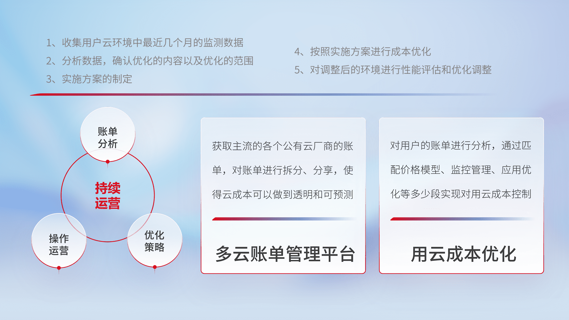 通过多云纳管,,,以统一的资源数据模型把客户的云资源进行抽象和封装,,,进而实现对多云资源的统一操作,,,,保障云资源管理的可靠性、、、稳定性与可用性。。量身定制化运维内容,,,,配置、、、、开发运维、、补丁管理、、、、备份、、、监控、、、认证和访问管理、、、、审计和日常巡检等,,保障在用云过程中的可靠度,,,,稳定度以及高可用率。。。。